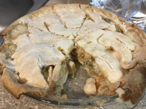 Put one of the pie crusts in a pie plate. Mix all of the other ingredients in a large bowl, then pour into the pie crust. Lay the remaining pie crust over the pot pie. Crimp the edges and cut off the excess crust. Cut slits in the pot pie for ventilation. Bake for at least 1 hour. (It works well for me at 1 hour 15 minutes.)